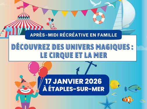 À propos Retour à la liste Des ateliers pour toute la famille ! Ateliers cirque et mer pour toute la familleVous cherchez une activité gratuite en famille à Étaples-sur-Mer ?En partenariat avec la Ville d'Étaples-sur-Mer, le Centre Social Caf d'Étaples-sur-Mer organise une après-midi récréative gratuite le samedi 17 janvier 2026, de 15h à 18h, à la Salle de la Corderie d'Étaples-sur-Mer. Un événement unique pour petits et grands, mêlant animations ludiques et ateliers créatifs sur les thèmes du cirque et de la mer. Au programme :Des spectacles pour les petits joués par la Compagnie Lassalle15h15 : Univers du cirque17h15 : Univers marinDes animations ludiques en continu : Disques tournants à colorier et décorer,Homme canon,Marionnette « cône »,Personnage à bascule,Jeux de lancers,Parcours de motricité,Pêche aux canards,Parcours sensoriel,Atelier maquillage/tatouages temporaires...Ces animations gratuites sont organisées par des professionnels du territoire et garantissent une expérience enrichissante pour les grands et les petits.Des ateliers créatifs sur inscriptionDes arbres à nos doigts (de 15h à 18h)3 ans et + | En continu | En libre accès et gratuitJeu de construction avec des planchettes en bois.L'édredon Surprise (16h)De 3 mois à 4 ans | Durée : 15 à 20 minutes. |️ 8 enfants max. par session - Sur inscription et gratuitDécouverte sensorielle avec des comptines.La boîte à musique de BoBi (16h30)3 ans et + | Durée : 20 minutes. | 6 enfants max. par session - Sur inscription et gratuitDécouverte musicale à partir d'objets récupérés.Les places étant limitées, nous vous invitons à vous inscrire en amont auprès de la crèche "À l'abordage" d'Etaples-sur-Mer au 03 61 22 10 46.Les enfants pourront repartir avec leurs créations manuelles. Informations supplémentaires : Par la Ville d'Etaples-sur-mer et le Centre social CAF.Renseignements et inscriptions : Crèche "À l'abordage" d'Etaples-sur-Mer au 03 61 22 10 46.