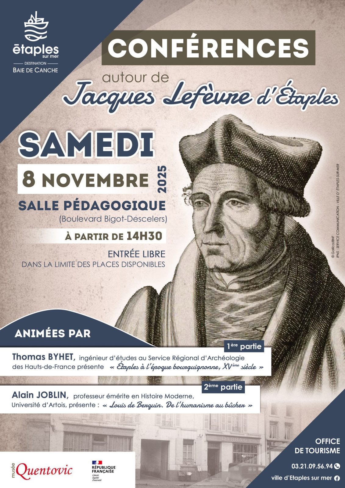 À propos Retour à la liste Conférences autour de Jacques Lefevre d'Etaples. La journée mettra l’accent sur cette période, ses contemporains et Étaples-sur-mer au XVe siècle. « Son intelligence claire, sa prodigieuse érudition, son esprit bienveillant et tolérant constituent les traits les plus marquants de sa personnalité, une des plus attachantes de notre histoire de France », d’après Emmanuel Leroy Ladurie (ancien Professeur au Collège de France, Président de l’Institut d’histoire sociale).