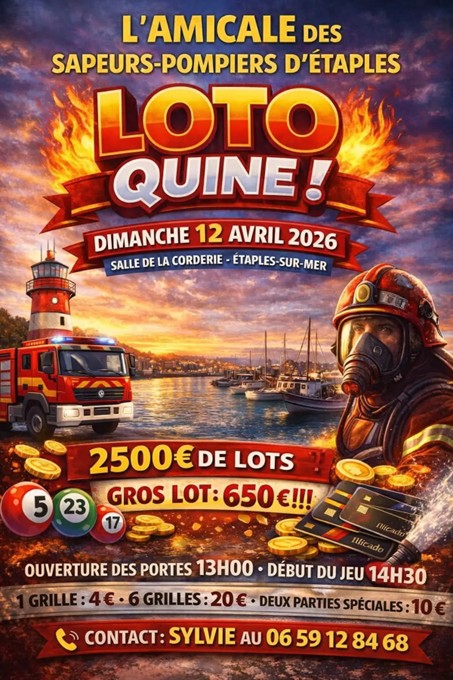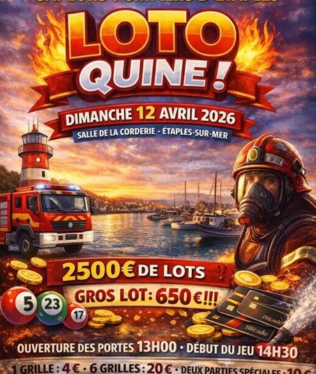 À propos Tarifs Retour à la liste Place aux joueurs de loto ! L'amicale des Sapeurs-Pompiers d'Etaples-sur-mer organise le célèbre jeu de loto.Venez passer un bon moment en famille ou entre amis pour tenter de remporter de très beaux lots d'une valeur de 2 500 € et un gros lot d'une valeur de 650 € ! Restauration et buvette sur place. Informations supplémentaires : Par l'amicale des Sapeurs-Pompiers d'Etaples.Renseignements : M. DUHAMEL au 03 21 89 79 43 ou au 06 59 12 84 68. Tarifs Tarif Min. Max. Tarif - La grille 0€ 4€ Tarif - Les 6 grilles 0€ 20€ Tarif - Les 2 parties spéciales 0€ 10€
