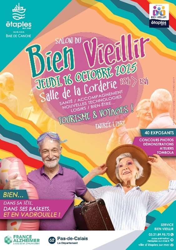 À propos Retour à la liste Salon sur le thème : "Bien dans sa tête, bien dans ses baskets !" L’équipe de la maison du retraité de la ville d’Étaples-sur-mer organise la deuxième édition du salon bien vieillir dédié aux séniors de plus de 60 ans. Avec pour thème cette année le tourisme, le public pourra trouver toutes les informations dont il a besoin pour occuper son temps libre et organiser ses voyages !Les visiteurs pourront également trouver tous les renseignements utiles qui concernent la vie associative, le logement (résidence autonomie, EHPAD, sécurité, aide à domicile), le portage de repas (chez soi au foyer ou en résidence), la prévention santé (activité sportive, soins, accompagnement, prévention des effets du vieillissement, visite à domicile, professionnels de la santé) ou pourra être accompagné pour faire valoir ses droits (aides financières, démarches administratives, droit à la retraite).Village d’exposants et animations musicales. Informations supplémentaires : Par le service "Bien vieillir".Renseignements au 03 21 89 95 75
