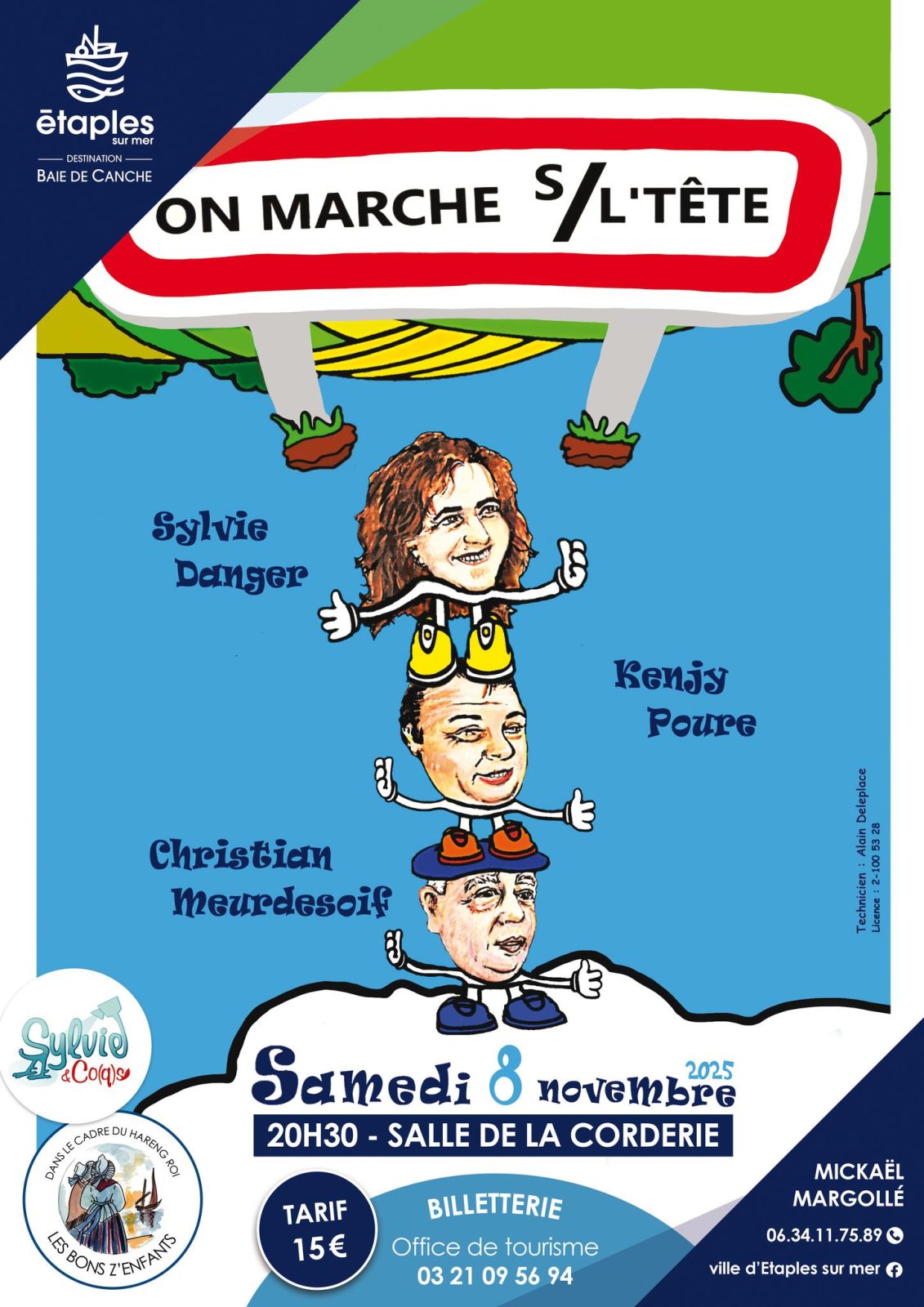 À propos Tarifs Retour à la liste On marche s/l'tête ! Dans le cadre du 32ème Hareng roi la compagnie « Sylvie & Co(q)s », vous propose d’assister au spectacle patoisant « On marche s/l’tête » qui aura lieu le samedi 8 novembre à partir de 20h30 à la salle de la Corderie. « Aller dire quand y a pus rin qui va, que tout va d’ travers, qu’on n’ sait pon d’où qu’on s’in va mais qu’on y va tout droit, ça n’ a pon d’ sins…Et pourtant… Quand tout sembe ête fait in dépit du bon sins, marcher sus l’tête devrot armette tout dins l’bon sins… Et pourtant… Alors, pour Eugène et Phonsine, faire preuve ed bon sins, dins un monde qui d’vient fou, croyez me c’est pon facile, i n’a là rin d’drôle, c’est pon à rire, et pourtant… »Retrouvez Sylvie Danger, Christian Meurdesoif et Kenjy Poure dans une comédie délirante, le tout dans un patois local où les absurdités du quotidien se transforment en éclats de rire. Billetterie à l'Office de tourisme d'Etaples-sur-mer. Informations supplémentaires : Par l'association "Les bons Z'enfants d'Etaples".Renseignements : Monsieur Mickaël Margollé au 06 34 11 75 89 ou à l'Office de Tourisme d'Etaples-sur-mer au 03 21 09 56 94. Tarifs Tarif Min. Max. Tarif - Par personne dans la limite des places disponibles. 0€ 15€