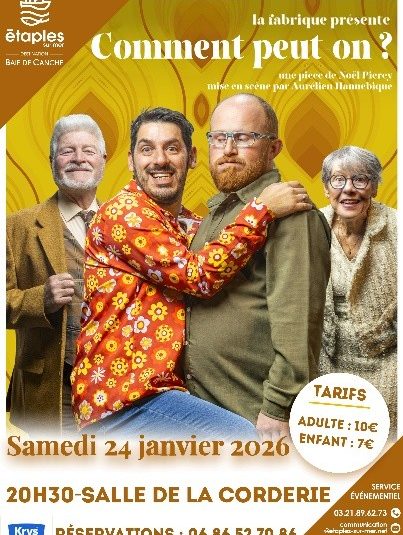 À propos Tarifs Retour à la liste Comment peut-on ? Cette pièce écrite par Noël Piercy est mise en scène par Aurélien Hannebique. L’action se situe ainsi : Jérôme et sa sœur Florence sont à Paris pour le travail depuis déjà longtemps. Les années ont passées et maintenant, Jérôme vit avec Sébastien alors que Florence (homo également) est avec Chloé. Ils n'ont jamais osé avouer leur homosexualité à leurs parents qui ne sont jamais venus à Paris et croient qu'ils habitent toujours ensemble. Le réveillon arrive, les parents aussi... Billetterie disponible à l’office de tourisme et en mairie.Ouverture des portes à 20 h. Informations supplémentaires : Par la troupe "La Fabrique".Renseignements : 06 86 52 70 86. Tarifs Tarif Min. Max. Adulte 0€ 10€ Enfant - moins de 12 ans 0€ 7€