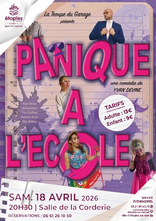 À propos Tarifs Retour à la liste Panique à l'école ! Une nouvelle rentrée des classes se prépare dans la petite école Sainte Rita où travaillent Cristina, la femme de ménage omniprésente et indiscrète, Sophie, l’enseignante innocente et trop studieuse et Solange, la prof cougar de retour d’un été « chaud » au cap d’Agde. Arrive alors Romain, un nouvel enseignant timide et maladroit que ses collègues vont confondre avec M Silovski, un inspecteur de l’Education Nationale fraîchement nommé par le Ministre en personne suite à une rencontre estivale insolite et … plutôt gênante !Dans cette comédie délirante, menée tambours battants, vous découvrirez une palette de personnages issus de l’Education Nationale qui verront leurs personnalités voler en éclat au fil des quiproquos. Cette pièce nous emmène dans les coulisses d’une école où rien ne va se passer comme prévu, à quelques minutes de l’arrivée des élèves. Ouverture des portes à 20 h. Informations supplémentaires : Par la troupe du Garage et le service évènementiel.Renseignements : 03 21 89 62 73. Tarifs Tarif Min. Max. Adulte 0€ 13€ Enfant 0€ 9€