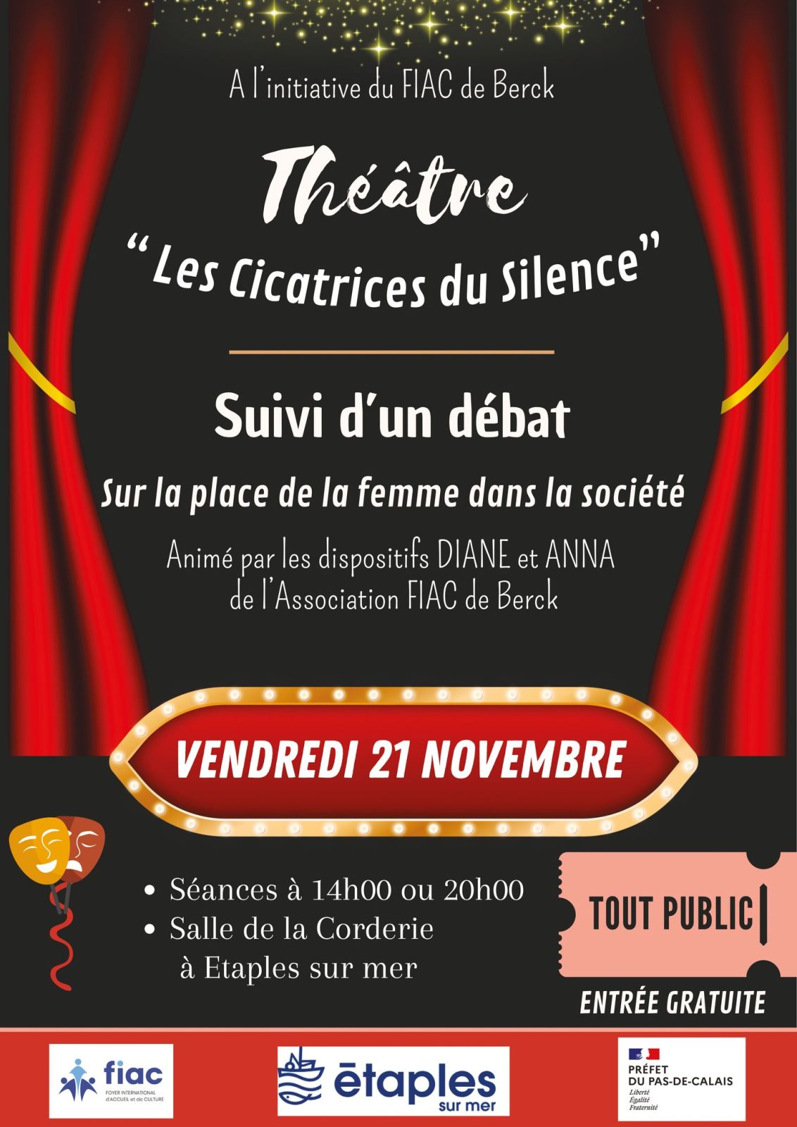 À propos Retour à la liste Les cicatrices du silence Dans le cadre de l’action « Mobilisons nous contre les violences faites aux femmes », le FIAC de Berck propose deux représentations de la pièce de théâtre intitulée « Les cicatrices du silence » au grand public. Les spectateurs pourront ensuite assister à un débat/forum sur la place de la femme dans la société animée par les professionnels des dispositifs DIANE et ANNA. Informations supplémentaires : Par le CCAS d'Etaples-sur-mer et le FIAC de Berck-sur-mer.Renseignements au 03 21 89 60 60.