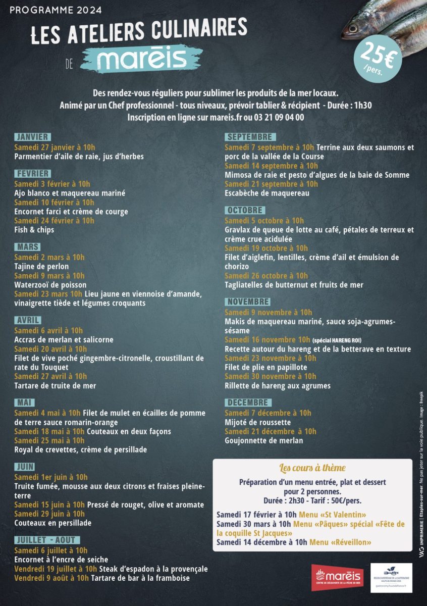 100% frais, 100% local & 100% convivial. Apprenez à préparer des recettes variées autour des produits de la mer et faites tomber les préjugés sur ces préparations qui paraissent parfois difficiles ! En compagnie de nos chefs cuisiniers, il n’en est rien et les secrets sont dévoilés au fil des recettes proposées à chacune des rencontres.Venez apprendre à préparer différentes espèces de poisson de saison, issues d’une pêche responsable. Que vous soyez novice ou roi des fourneaux, chaque cours, encadré par un Chef expérimenté qui partage ses secrets est une invitation à découvrir les saveurs de la mer dans une ambiance conviviale et avec un matériel mis à votre disposition.Au four, poêlé, cru, à la vapeur, le poisson ne manquera pas de vous étonner. De l’encornet à la Saint Jacques en passant par la sole ou la lotte, apprenez avec nos Chefs professionnels, toutes les techniques et gestes de préparation & de cuisson des poissons, coquillages et crustacés. Globe-trotter culinaire ou amateur, réalisez les recettes traditionnelles comme celles plus raffinées ou inventives… il y en a pour tous les goûts ! Découvrez vite toutes les thématiques de nos cours et choisissez celle qui vous permettra de cultiver vos sens, de satisfaire toutes vos envies et de cuisiner malin !La formule est très simple : on arrive les mains dans les poches, on revêt un tablier, et c’est parti pour 1h30 de cuisine ! Tout le matériel et les aliments sont mis à disposition et le chef de l’atelier est là pour dispenser ses conseils pour la préparation du plat.Renseignements : Centre Maréis : 03 21 09 04 00 ou par mail contact@mareis.frProgrammation et réservation sur le site internet de Maréis Lire plus Le marché d’Etaples-sur-mer Lire plus Le marché aux poissons du port Lire plus Le marché nocturne du terroir Lire plus La fête du Hareng Roi Lire plus La fête de la Coquille Lire plus Le parcours de la mer à l’assiette Vous aimerez… nos suggestions